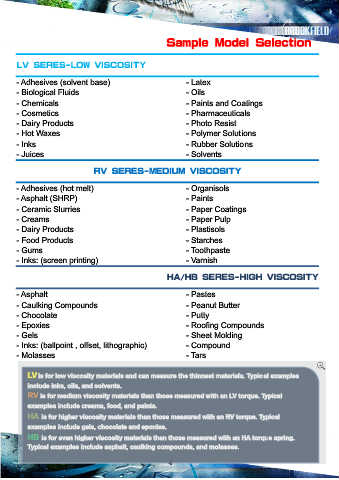 LV is for low viscosity materials and can measure the thinnest materials. Typical examples